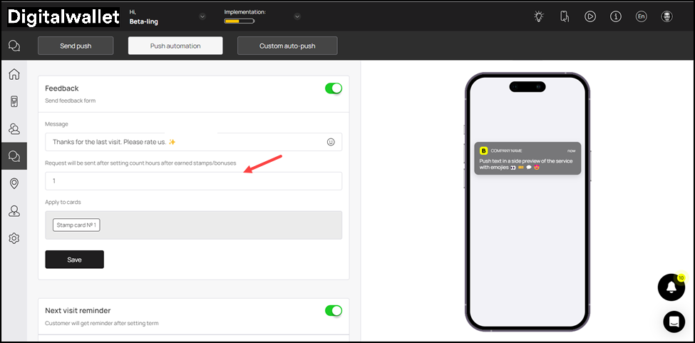 6\. Using the next field, you can set the number of hours upon visit after which the push notification for feedback is sent.